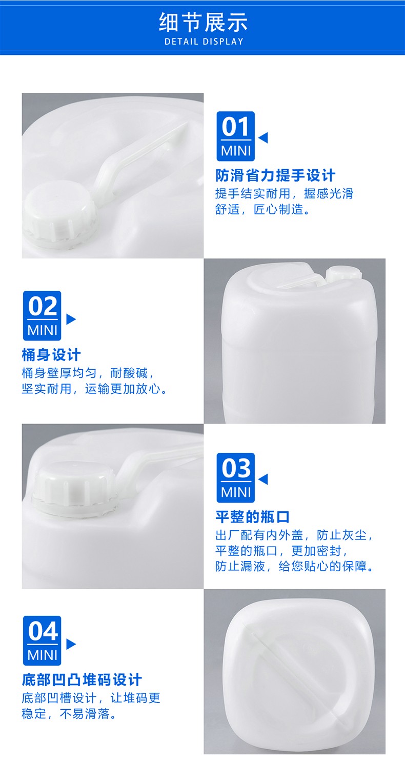 采用全新聚乙烯原料吹塑工藝制作而成,具有耐腐蝕,耐酸堿性,小口設(shè)計(jì)密封性能強(qiáng),廣泛應(yīng)用于化工清潔劑,表面處理劑、輔料添加劑、飼料添加劑, 樹(shù)脂農(nóng)藥,日用化學(xué)品,聚氨酯、膠黏劑 消泡劑 電解液等各行業(yè)液體包裝。